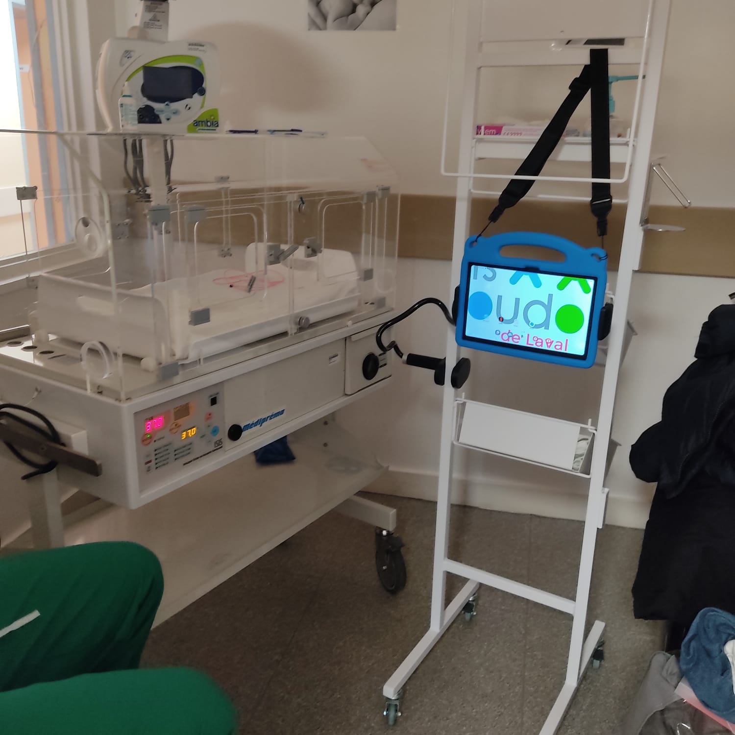 La maternité a mis en place le dispositif Baby Cam, permettant aux mamans, même après une césarienne, de suivre en direct les premiers soins de leur bébé grâce à une tablette équipée d'une application de visio-conférence. Cette solution renforce le lien parent-enfant, même en cas de séparation temporaire