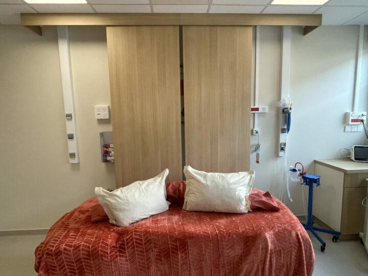 L’ensemble du matériel médical nécessaire est présent dans la salle : un lit médicalisé modulable en table d’accouchement, une barre de suspension, un scope, un tensiomètre, un monitoring, ainsi que le matériel de perfusion.