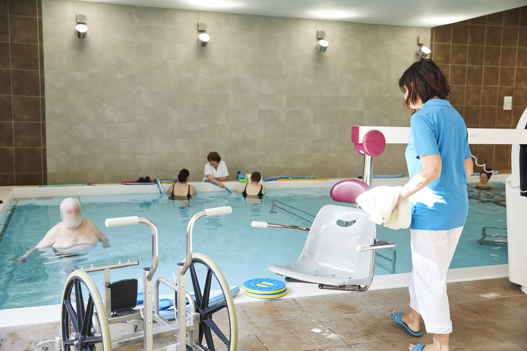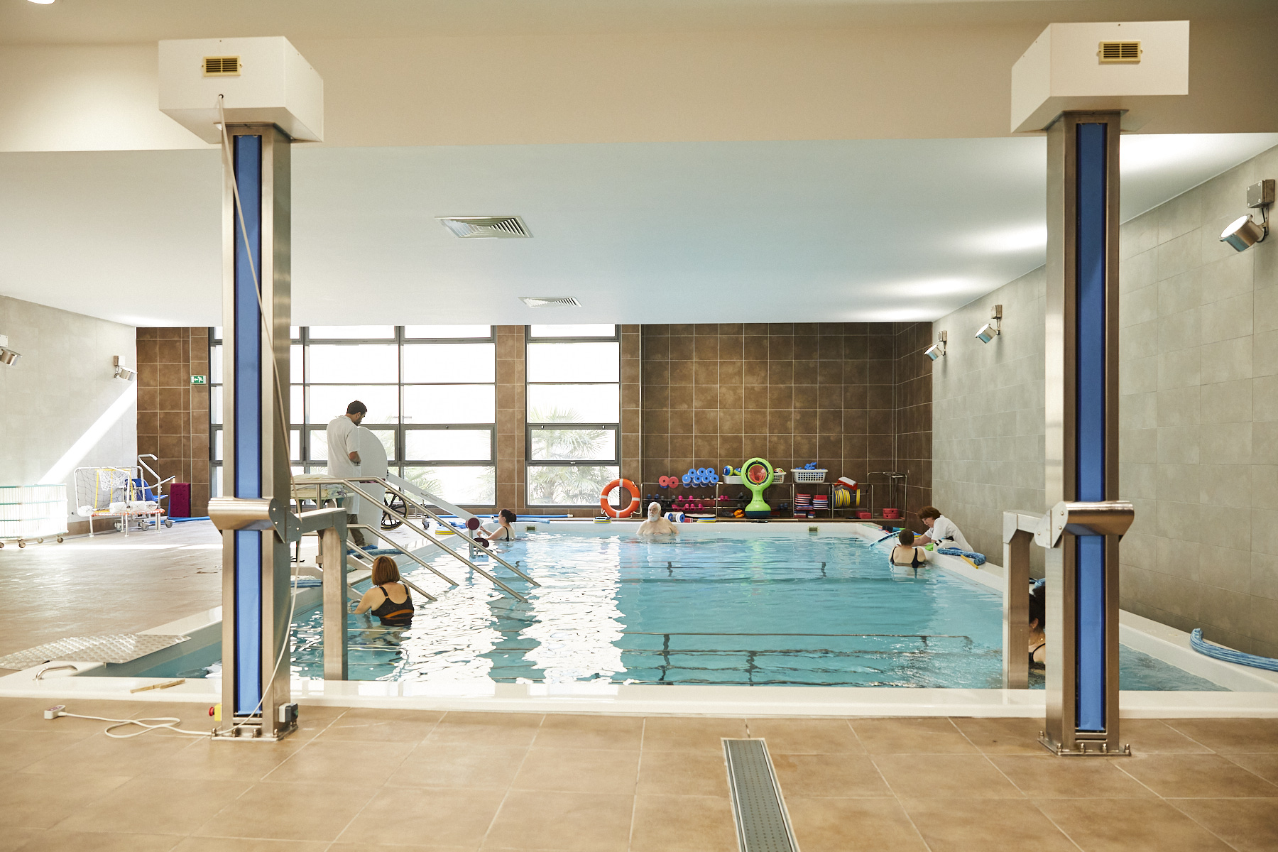 Le plateau technique dispose d’un espace balnéothérapie pouvant accueillir toutes les déficiences. La piscine principale (85m3) est longée par une fosse d’immersion et dispose d’une plateforme d’accès aux personnes en fauteuil roulant, d’un couloir de marche à hauteur variable.